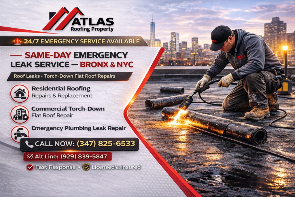 At Atlas Roofing & Property Services, we provide fast leak repairs for residential roofs, comercial flat roofs (torch-down), and plumbing leaks. We also offer storm damage inspections and claim support.