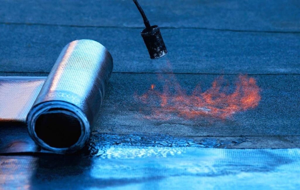 Professional,Roofer,Applying,Bitumen,Roll,On,Flat,Roof,With,A